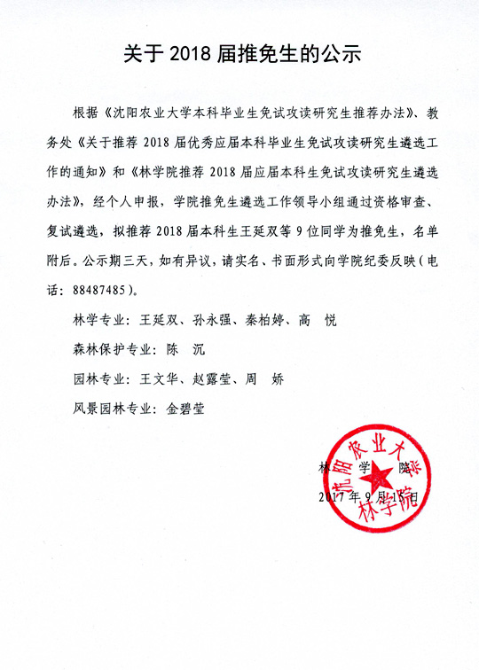 关于2018届推免生的公示